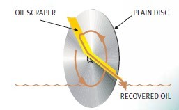 轉(zhuǎn)盤盤片:盤邊緣帶擋邊的T型盤,特別適合于回收較低粘度的溢油;親油疏水的光滑圓邊圓盤,適合回收中、低粘度的溢油。